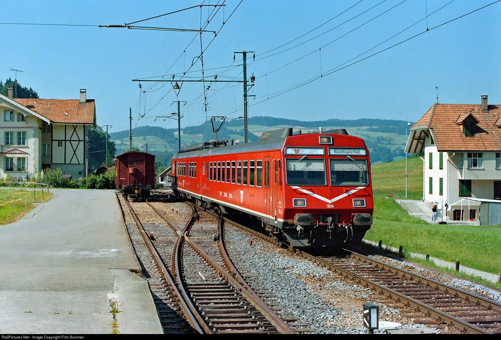 | On July 19, 1990 the push-pull train RBDe 4/4 II 229/329 of the EBT (built in 1985) is arriving as course 4564 Burgdorf-Thun at Schafhausen station.