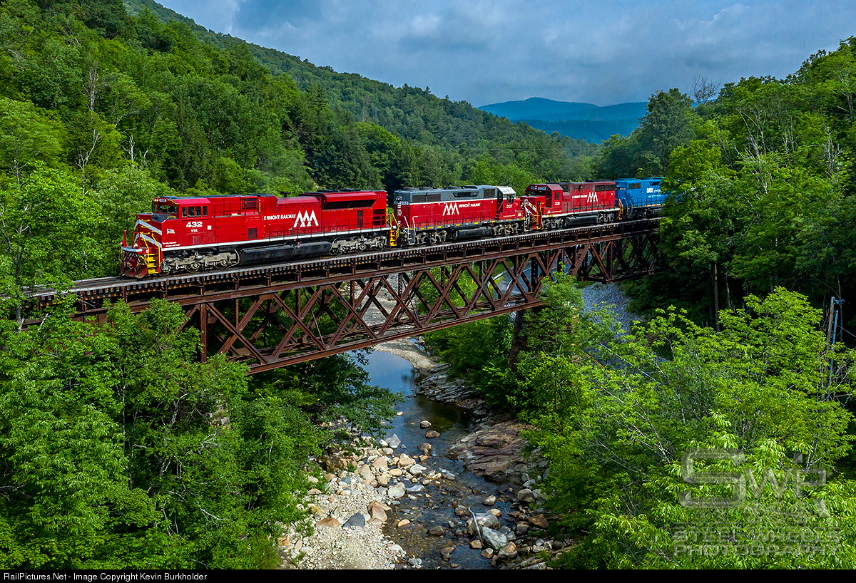 GMRC train 263, led by Vermont Railway SD70M-2 432, VTR GP38-2 207, GP40-2 308 and GMTX GP38-2 2215, is crossing the Mill River on the famous Cuttinsville Hanging Bridge on July 20.