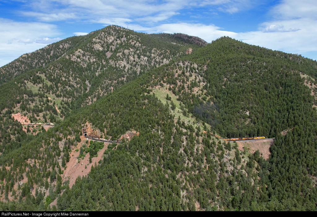 A westbound Union Pacific military train climbs through the Tunnel District just east of Crescent, Colorado, on the afternoon of June 16, 2017. The long train of military equipment from Fort Carson, near Colorado Springs, is heading to Yermo, California, on Union Pacific’s Moffat Tunnel Subdivision. EMD SD70M No. 4900 is on the lead of a train of DODX flats loaded with Stryker combat vehicles that is threading Tunnel Nos. 12, 13, and 14, and about to enter Tunnel 15 in this view.
