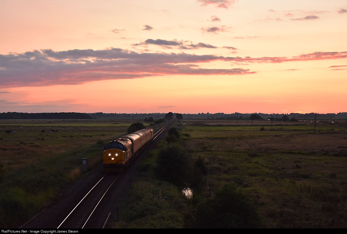 | With the sun a few minutes below the horizon 37424 is seen between Acle and Great Yarmouth hauling the 20:40 Norwich - Great Yarmouth.