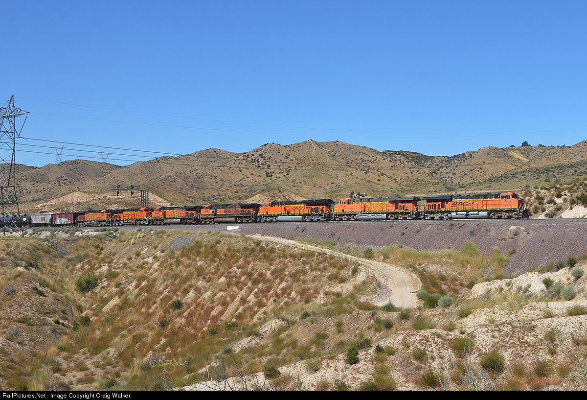 Grinding uphill in Cajon Pass is BNSF train U-WATAXT7-12, an empty ethanol train heading back to Axtell, Nebraska, from Watson, California. This train, passing through Silverwood in Cajon Pass and pulled by seven diesels (ES44DC 7772, ES44DC 7703, ET44C4 3756, Dash 9-44CW 1090, Dash 9-44CW 4784, ES44C4 4283 and Dash 9-44CW 4856), is about at the Summit.
