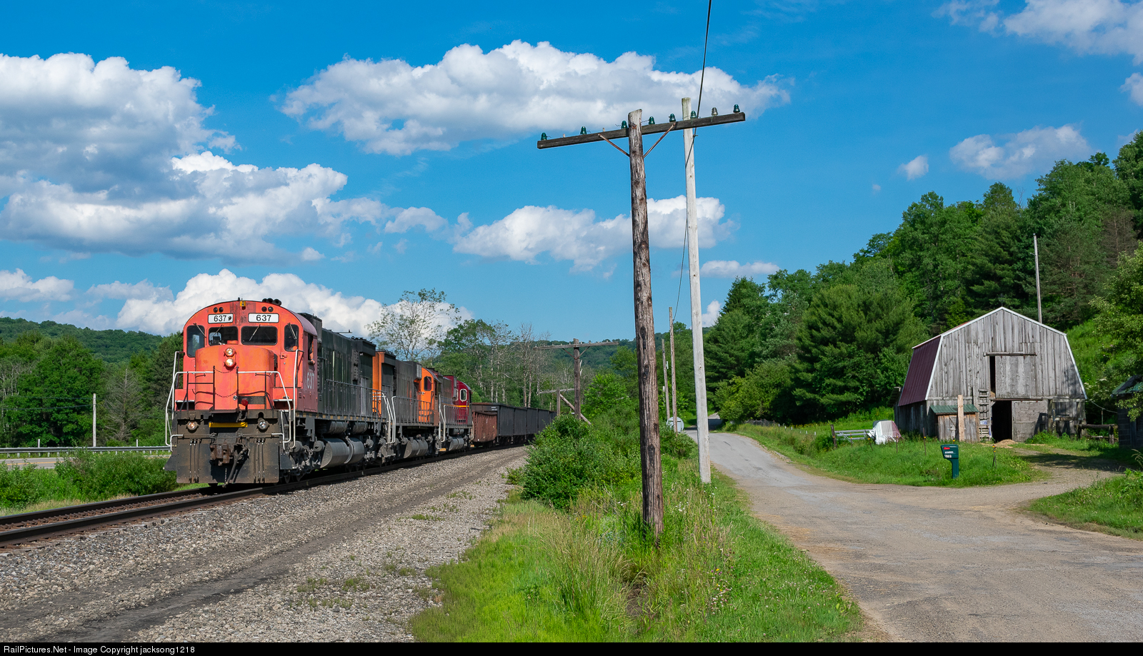 The NB run of the WNYP's Driftwood turn featured 3 six axle alcos on June 27th. The train is seen here passing an old code line pole and a similar vintage barn in Liberty, PA.
