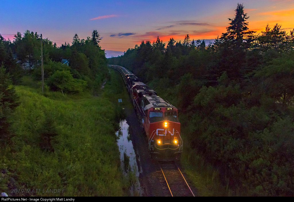 In day's last light, train 406 descends down the grade at Quispamsis, about 8 miles east of Saint John, New Brunswick. It was about a three mile uphill climb, cresting about a mile from my location. With a train of mostly empties, it wasn't a huge challenge.