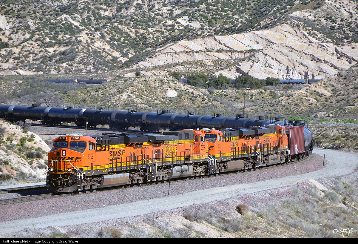 Winding its way downgrade in Cajon Pass, California, is a unit train of 98 loaded ethanol tank cars, heading from Chancellor, South Dakota, to Watson, near the ports of Long Beach and Los Angeles. This 6292 foot, 13653 ton train is powered by BNSF Railway ES44C4 6709, BNSF AC4400CW 5839, BNSF ES44C4 8027 and BNSF ES44C4 7163 on the head end, and BNSF ES44AC 5997 and CSXT ES44DC 5286 on the rear. (March 18, 2019)