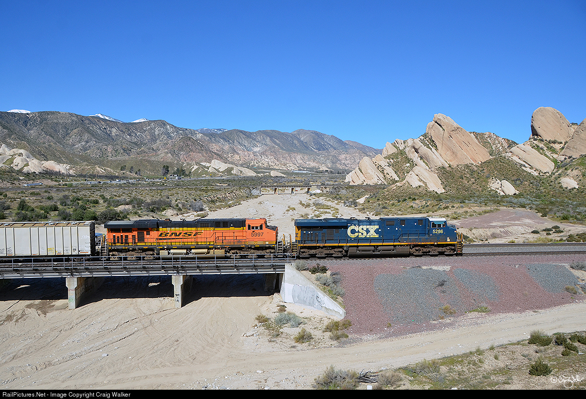 Winding its way downgrade in Cajon Pass, California, is a unit train of 98 loaded ethanol tank cars, heading from Chancellor, South Dakota, to Watson, near the ports of Long Beach and Los Angeles. This 6,292-foot, 13,653-ton train is powered by BNSF Railway ES44C4 6709, BNSF AC4400CW 5839, BNSF ES44C4 8027 and BNSF ES44C4 7163 on the head end, and BNSF ES44AC 5997 and CSXT ES44DC 5286 on the rear. (March 18, 2019)
