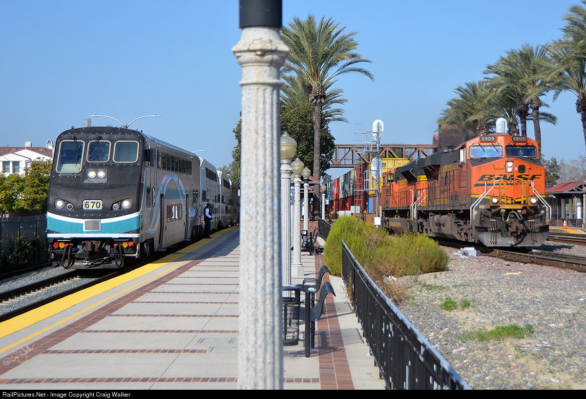 Metrolink train 632, a Fullerton to Laguna Niguel/Mission Viejo shuttle, boards on Track 4 in Fullerton, California, while BNSF Railway train S-LHAATG1-24 (Los Angeles Harbor-Pier 400 to Atlanta GA) heads east on Track 3 (but it is crossing over to Track 2, since beyond this Control Point Track 3 changes from BNSF to Metrolink ownership, and heads south to San Diego). The Metrolink train has cab car 670 on the head end, and F59PHI 887 on the rear, while the BNSF train is powered by ES44AC 5909 and SD70ACe 9272 (with ES44AC 6061 on the rear). The Metrolink train departs in another four minutes. (March 25, 2019)