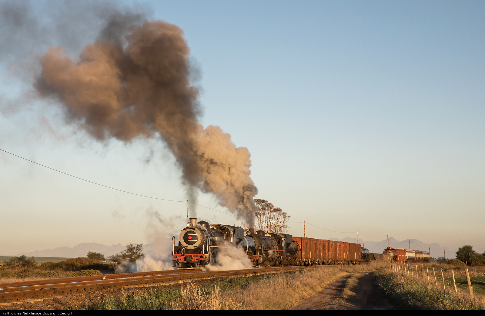 | 4-8-2 19D # 3322 and 2-8-4 24 # 3655 of the Ceres Rail Company are departing from Wintervogel station on the Klawer with the mixed freight/passenger train of the FarRail Tours 9 day steamtrain journey through the Western Cape province. |