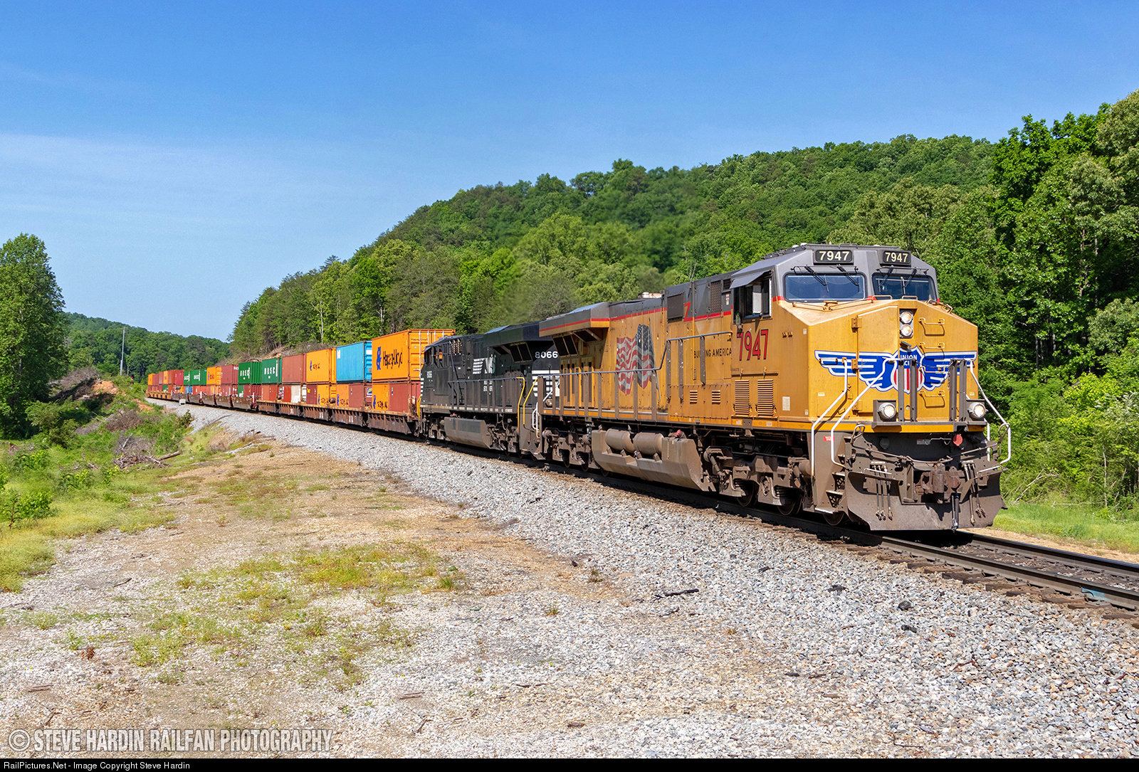 A Union Pacific GE unit leads the charge up Braswell Mountain with a long string of intermodal containers in tow.
