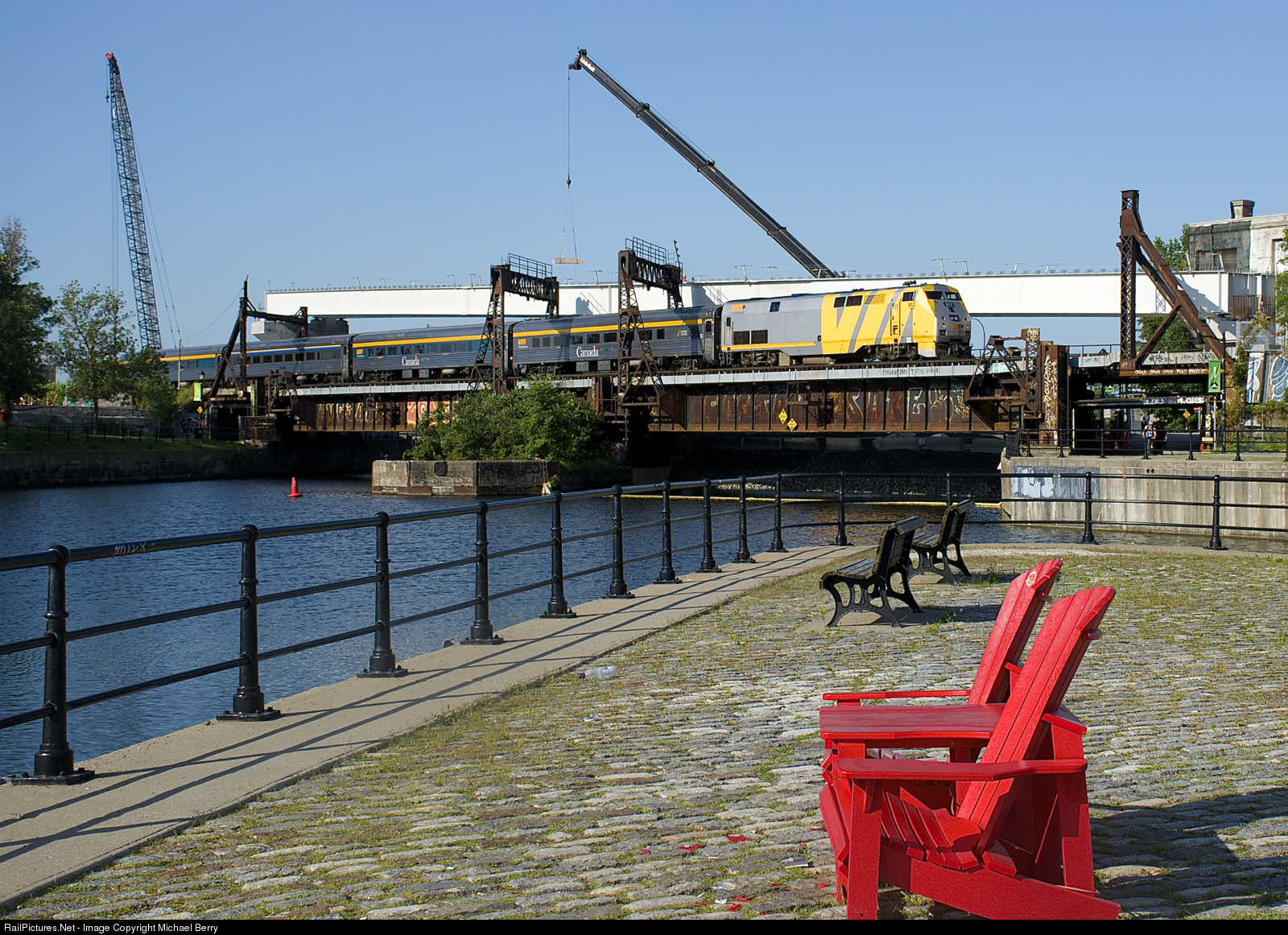 | VIA 913 leads 4 stainless steel cars over the Lachine Canal as VIA 22 approaches Central Station. VIA 913 lost its VIA 40 logo last fall when it briefly wore a poppy for Remembrance Day on its long hood. After that was removed it has not had any new logos or slogans added just yet. |