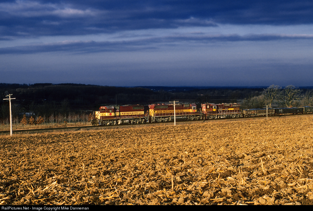 An eastbound (southbound) Wisconsin Central dirt train is just north of Byron, Wisconsin on the morning of December 3, 1994. A cool lash up of SDL39 No. 584, SD45 No. 6598 and Duluth, Missabe & Iron Range SD9 No. 161 power the train up Byron Hill. This is the only sunny photo we got on this short winter day, as clouds were quickly rolling in.