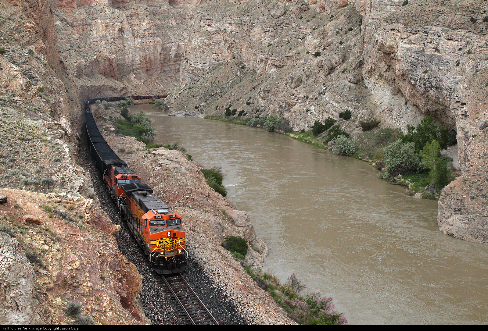 BNSF5141 exits Sheep Canyon along the banks of the Little Big Horn River. The narrow defile cuts thru sheep mountain and makes a easy and spectacular passage thru the mountain. The head end of the train has a cut of Coke from the refineries in Billing's Montana.