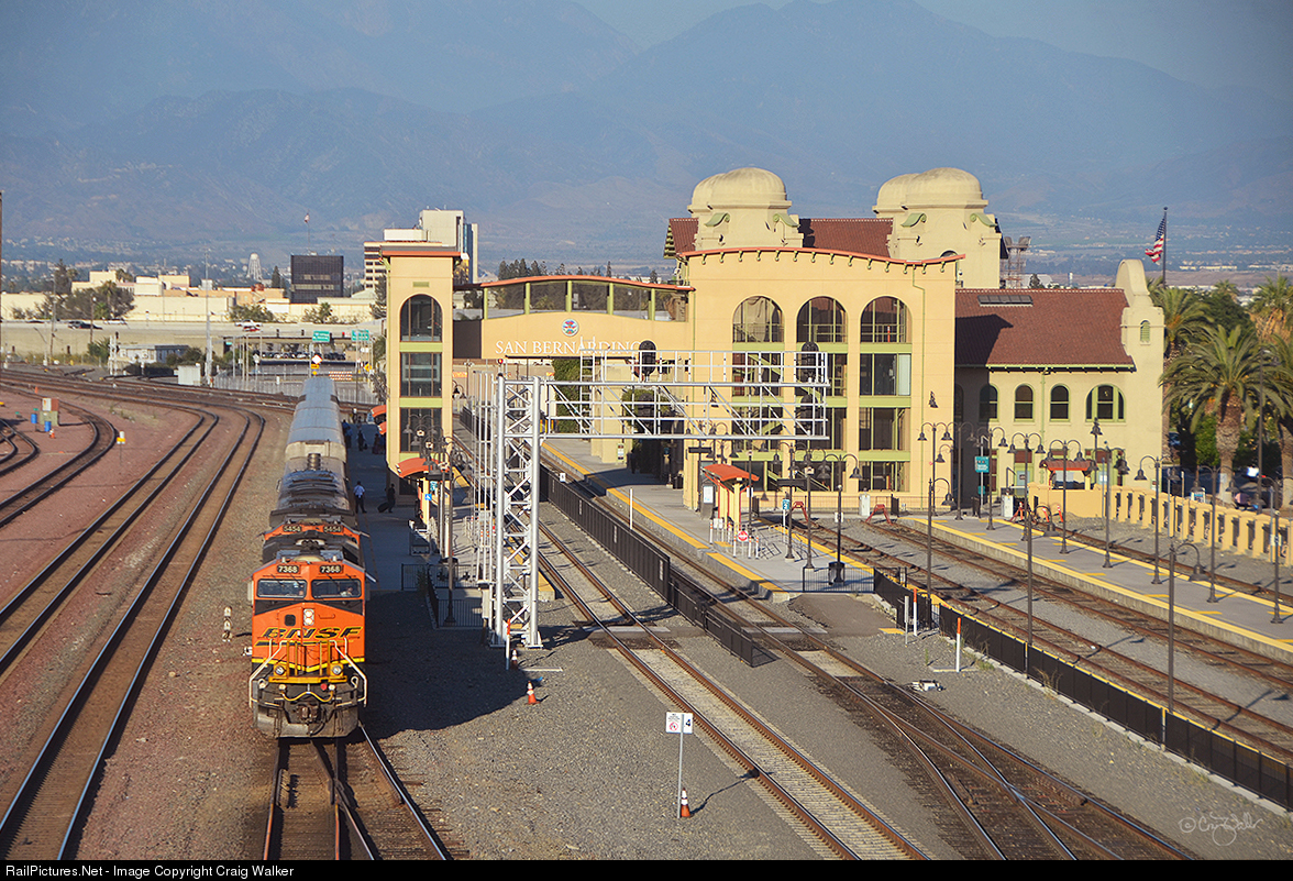Running 13 hours behind schedule, Amtrak train 3, the westbound "Southwest Chief," finally makes its 5:42 am stop in San Bernardino, California, at 6:49 pm on July 13, 2019. The two BNSF diesels were added in Kansas City two days earlier. Recent changes to the Metrolink portion of this station resulted in the large stair/elevator structures to enable passengers to cross the tracks on the pedestrian walkway. Unfortunately, this has obscured the view of the beautiful and historic former Santa Fe passenger station, built in the Mission Revival Style (with Moorish Revival and Spanish Colonial Revival features) and opened in 1918.