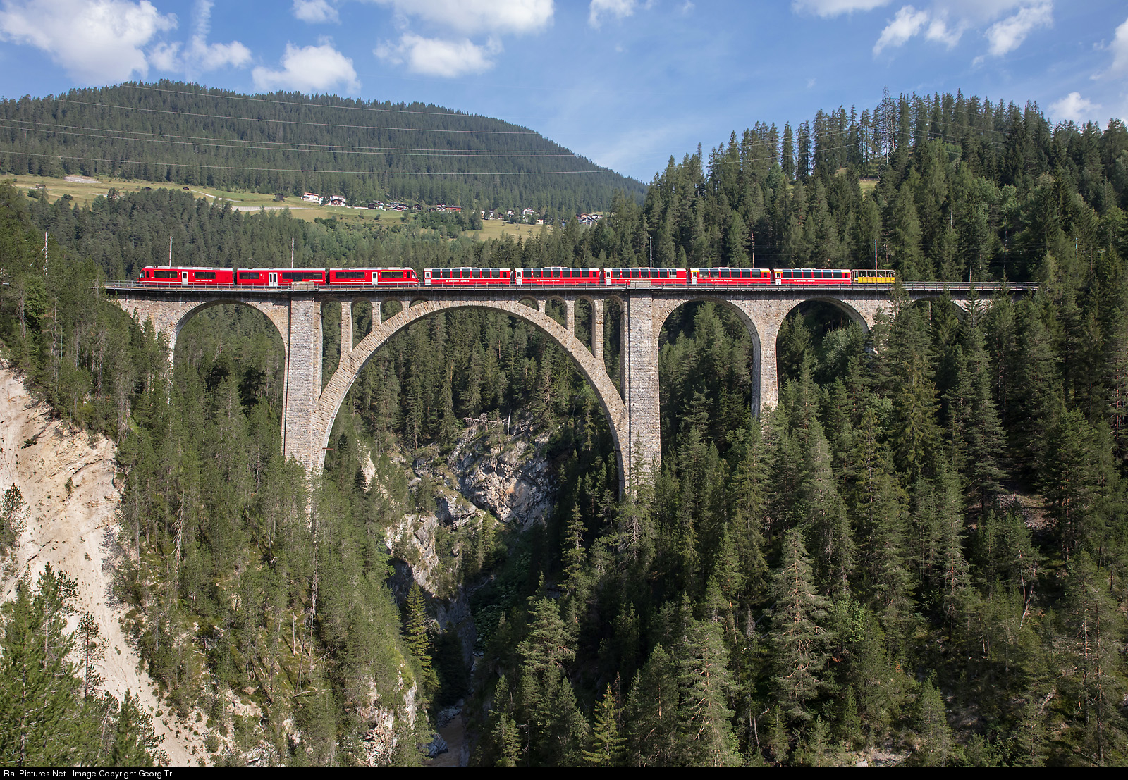 The PE (Panorama Express) 961 BERNINA EXPRESS from Landquart via Klosters-Davos-Filisur-Alp Grüm-Poschiavo-Tirano is crossing the highest viaduct of the Rhaetian Railway network, the 89 meter high and 210 meter long Wiesen viaduct, with a main span of 55 meter. "Allegra" railcar ABe 8/12 # 3504 is pulling 3 second class and 2 first class panorama cars, and in the rear a yellow two axles open observation car, running from Davos Platz to Tirano, new since the last season. The impressive viaduct was built from 1906 to 1909, is the longest stone arch bridge of the RhB and the second highest railway bridge of Switzerland.