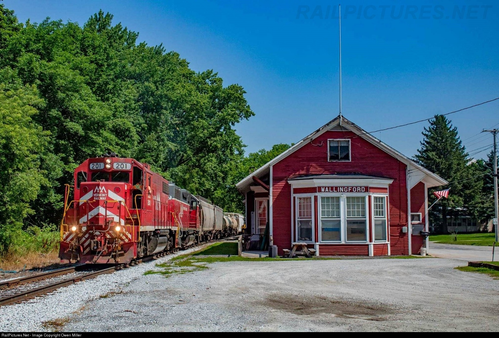 | VTR 201 is leading VRS's Rutland to North Bennington Job (RDNR) on July 25th, 2019. Here we see the train pass the historic Wallingford Depot, which is now home to the Wallingford Fire Department. |