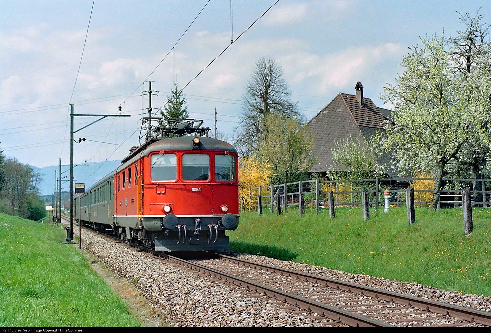| On April 26, 1992 the Re 4/4I 10043 with the regional train 6071 runs in the spring landscape towards the near Herzogenbuchsee terminal station, where the locomotive will bypass the wagons for the return journey to Solothurn. There is nothing to suggest that everything will be history by 31 May....