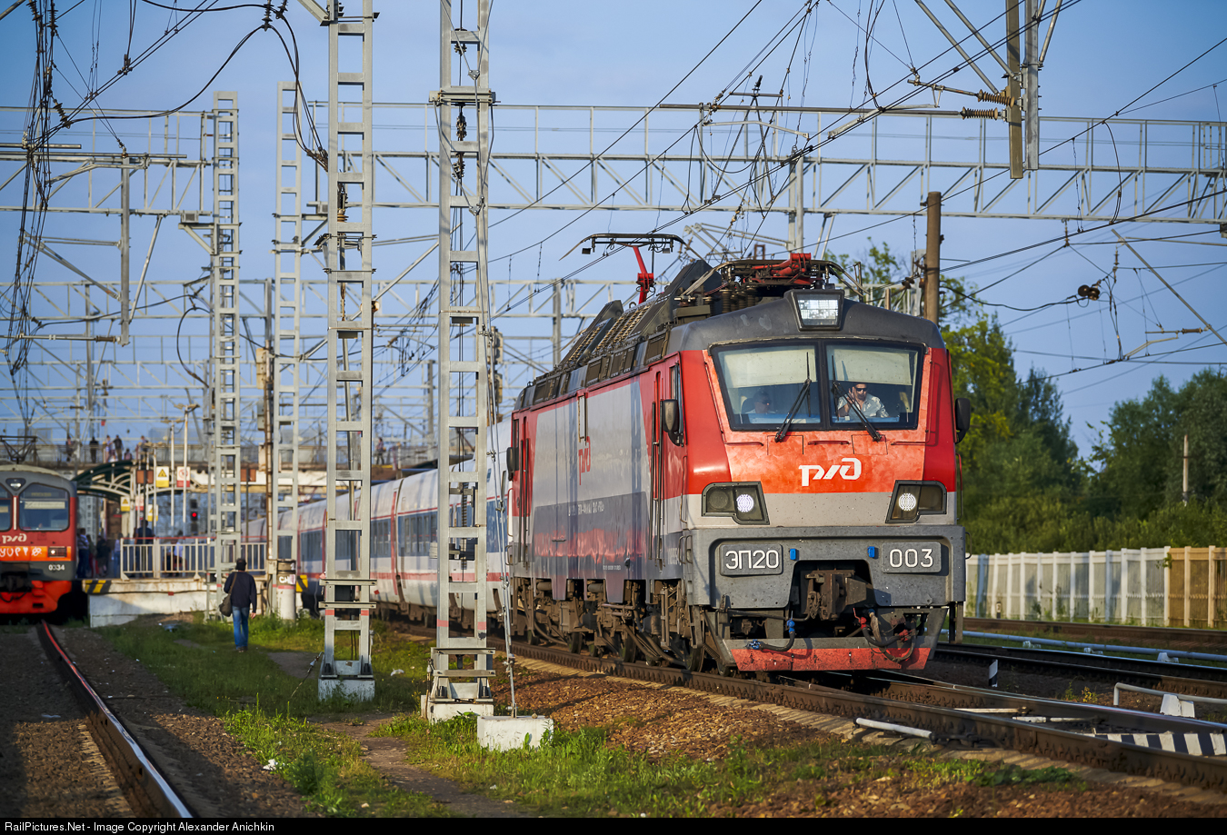 | EP20-003 AC/DC locomotive with a high speed passenger train Strizh (Talgo modified for Russian railways) flies through Fryazevo station |