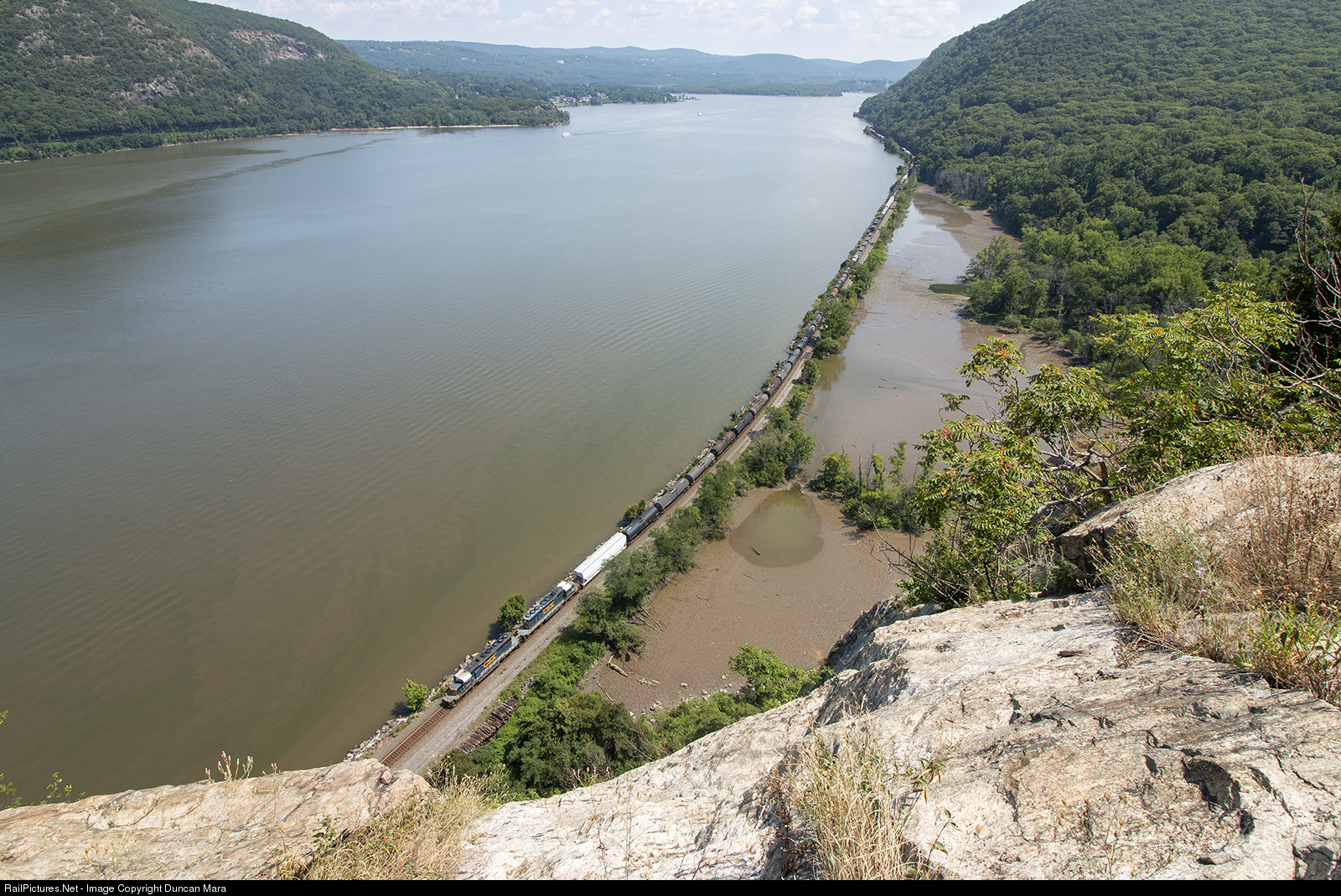 | CSX Q434 runs north along the Hudson River on the River Subvision with a pair of Hudson Line SD40-2s, with cut plows to make 3rd rail clearances on Metro North on the other side of the river. |
