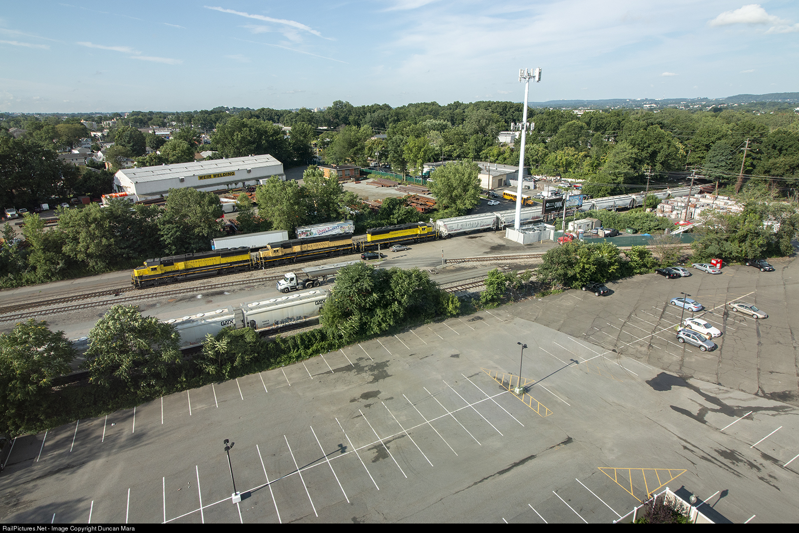 | NYS&W SU-100 coming through Passaic Junction (junction with the NJT Bergen County Line) and into their PC Yard across Midland Ave in Saddle Brook. The top floor restaurant and bar of the Crowne Plaza provides a great panoramic view of the surrounding area, allowing for photos like this to be captured. |