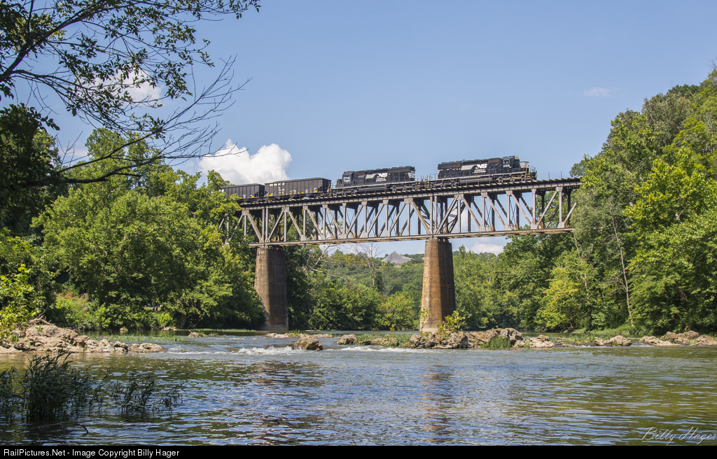 NS T08 crosses the North Fork Holston River coming into Kingsport, with a pair of SD40-2's leading Eastman coal loads.