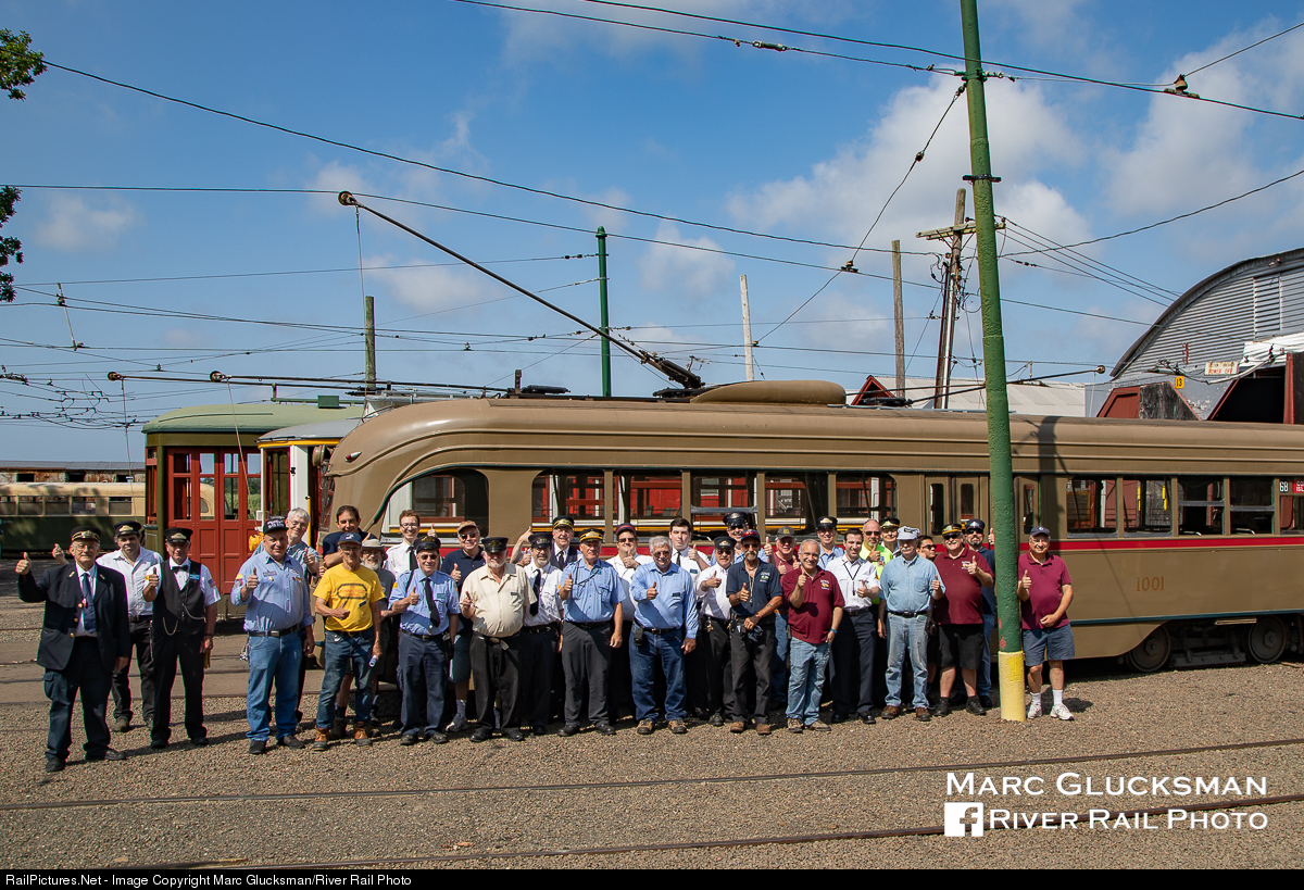 Ready to roll! Over forty volunteers assisted in bringing together "Museum In Motion" (a.ka. Trolley Parade) at the Shore Line Trolley Museum on Saturday, July 27, 2019. Twenty three pieces of equipment were put on display for the crowd, but one of the highlights of the day was the return of Brooklyn PCC 1001, the first production PCC on its maiden run since it rehabilitation from Hurricane Irma inflicted damage. The crew comes together after receiving the safety briefing for the day to pose for a photo.