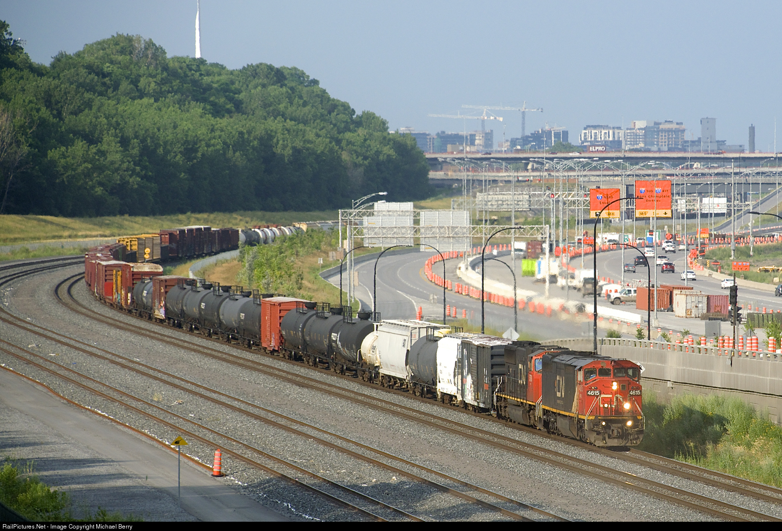 | After having to change leaders before departing Southwark yard, CN X321 is approaching Turcot Ouest with repainted BCOL 4615 & CN 5761 for power and 126 cars. 4615 still sports class lights and double ditchlights. |