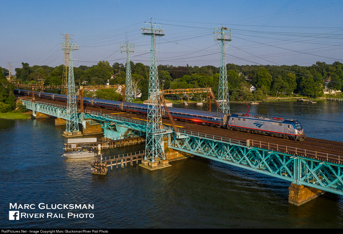 | Returning from a weekend out of the city. Amtrak Train 165 passes through Cos Cob, CT over the Mianus River on the evening of Sunday, July 28, 2019. Siemens built ACS-64 654 leads a long train of AmFleet cars towards New York Penn Station who prefer “leave the driving to Amtrak” over the traffic filled roads. |