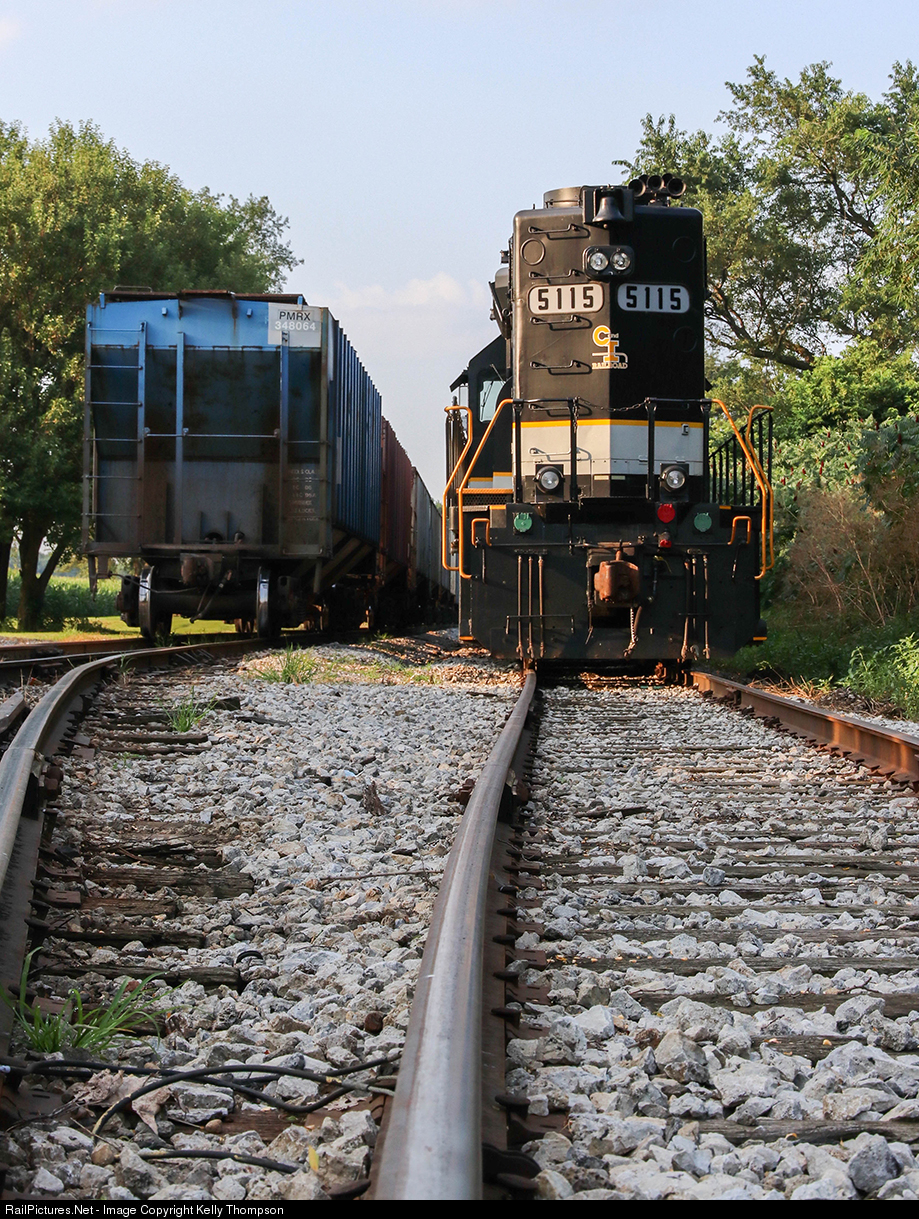 | IBCX 5115 sits in the morning sun by a cut of grain cars in Union Mills, Indiana. 5115 is one of two units in the very classy Southern inspired scheme. Based off of the horn position, they are prepared to run this unit Southern style! |