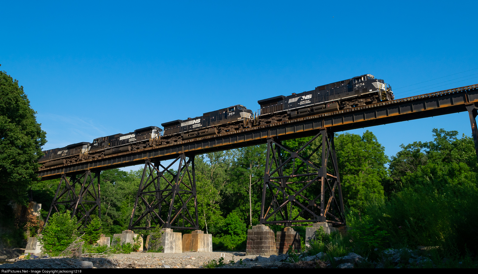 | Norfolk Southern train 309 is high above Chautaugua Creek with 5 units on the head end. This s one of many trestles on this section of the NS line, but only few are accessible. |