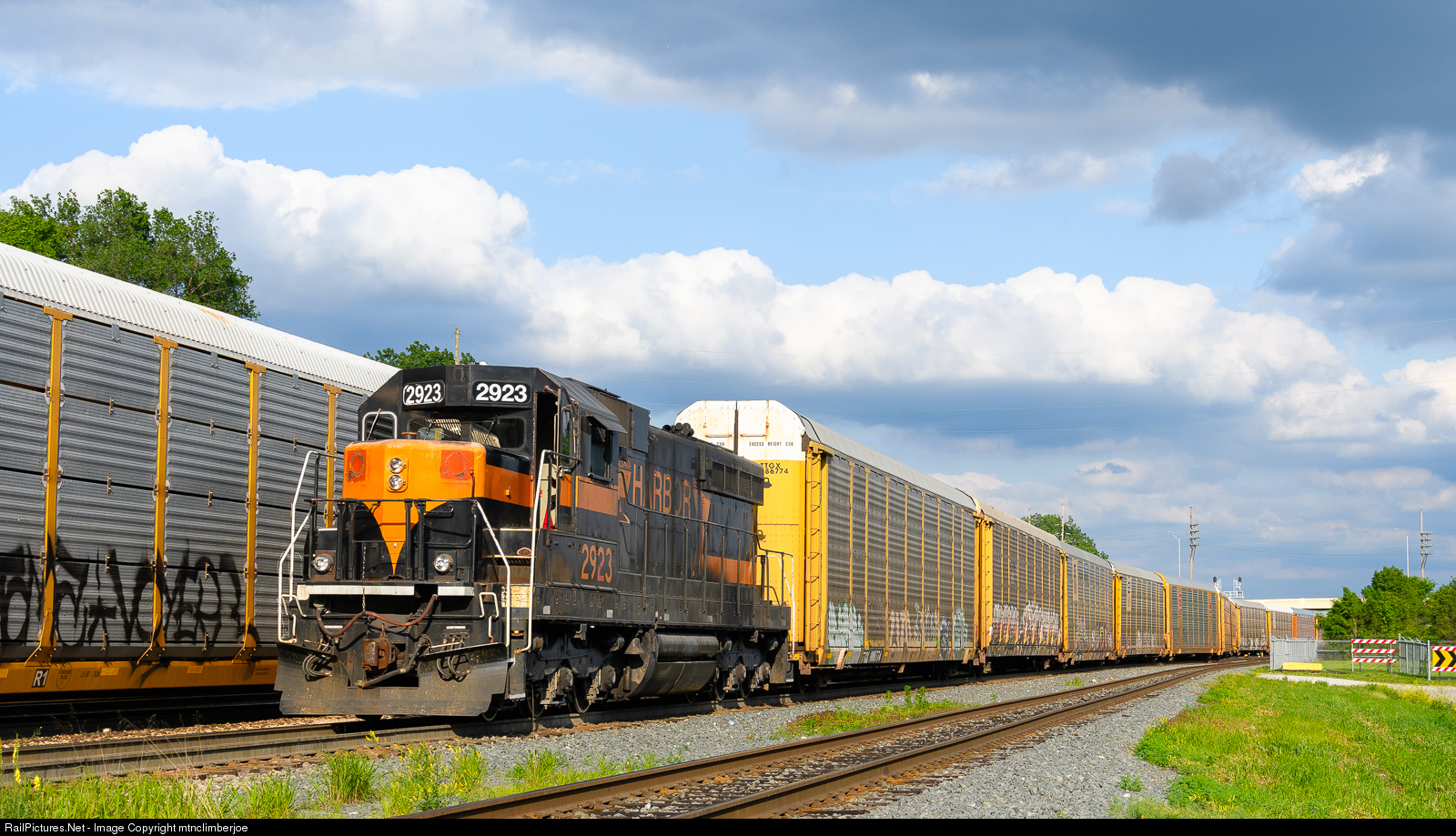 One of the more unique locomotives on the Indiana Harbor Belt roster, EMD SD20 2923, is working the west end of Gibson Yard, switching cuts of autoracks on a June evening.