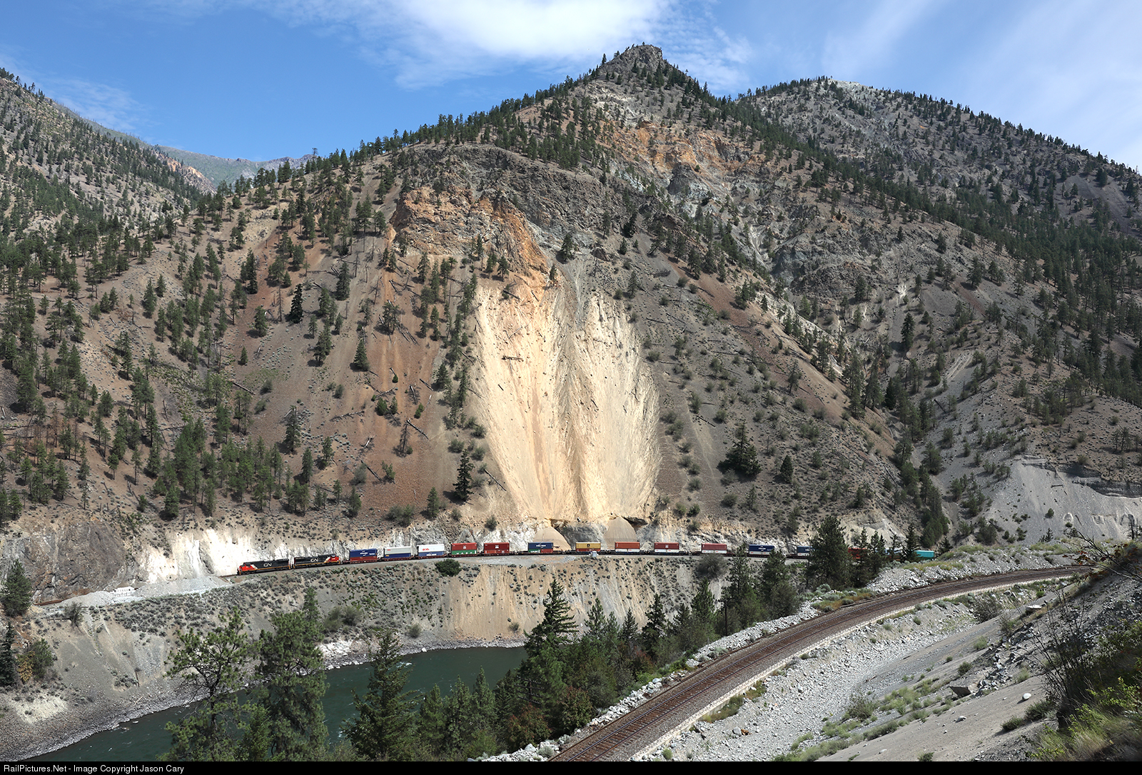 Canadian National moves a westbound stack train into the White Canyon near Lytton, British Columbia. The train is running on CN owned track, and the track in the foreground is Canadian Pacific owned. Westbound trains run on the CN track, while eastbound trains move on the CP. This directional running allows for a more efficient movement of the large amount of rail traffic this canyon sees each day.