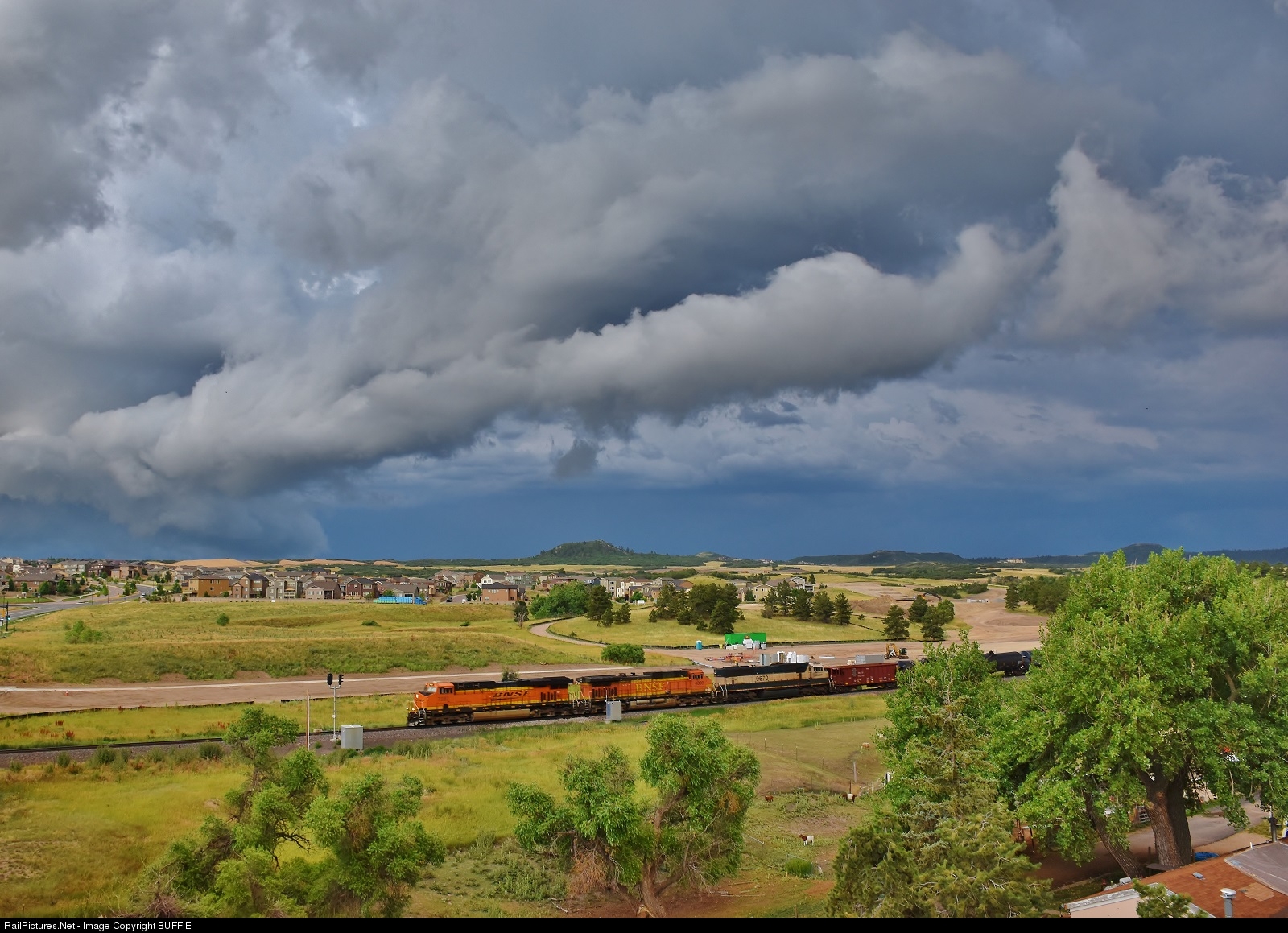 | BNSF 7387 (ES44DC) tries to outrun the turbulent storm that has brought heavy hail and rain to Castle Rock, Colorado. |