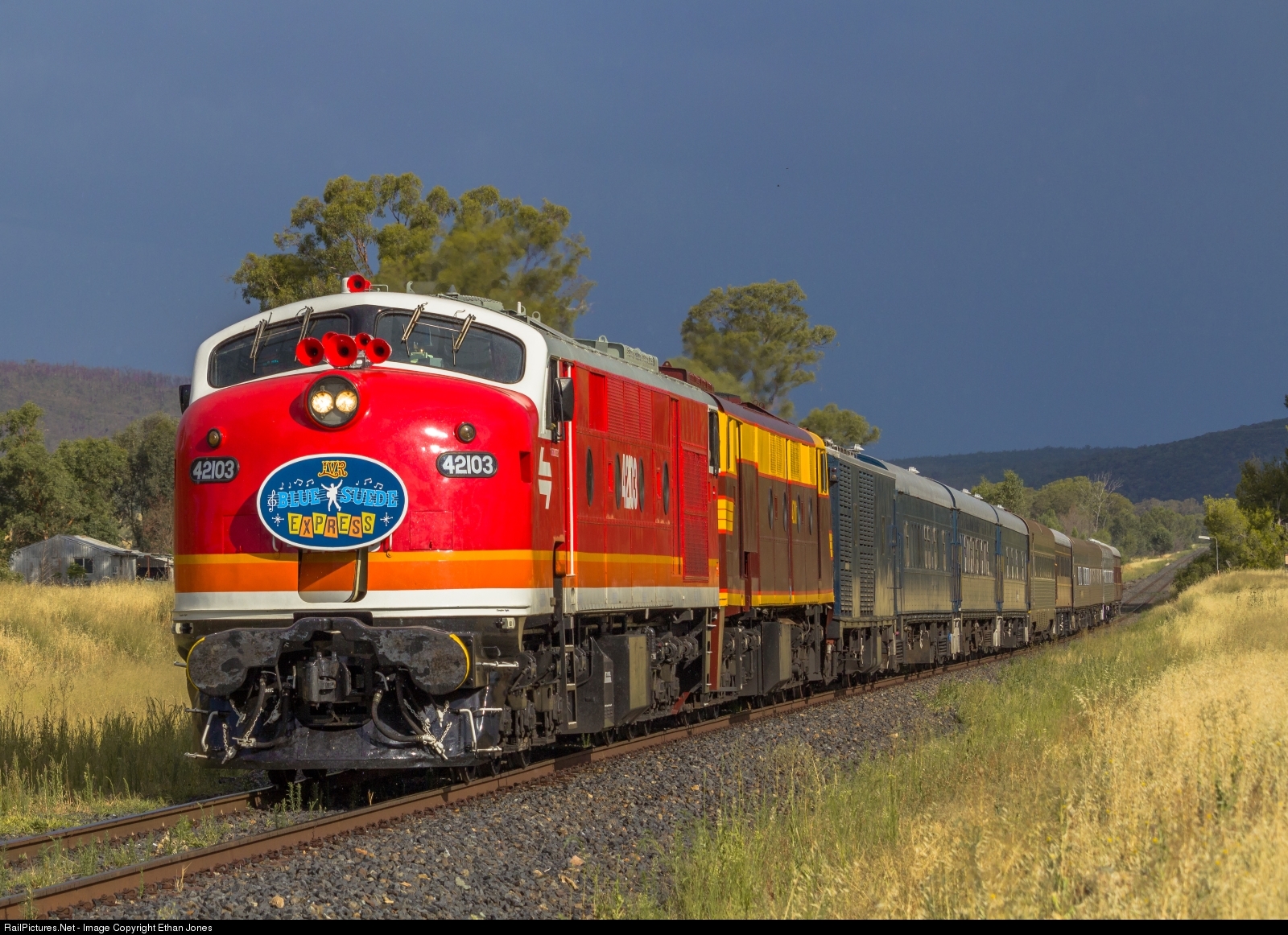 | Not wasting any time on the straight section, 8L37 races through Cookamidgera as dark skies linger behind it.