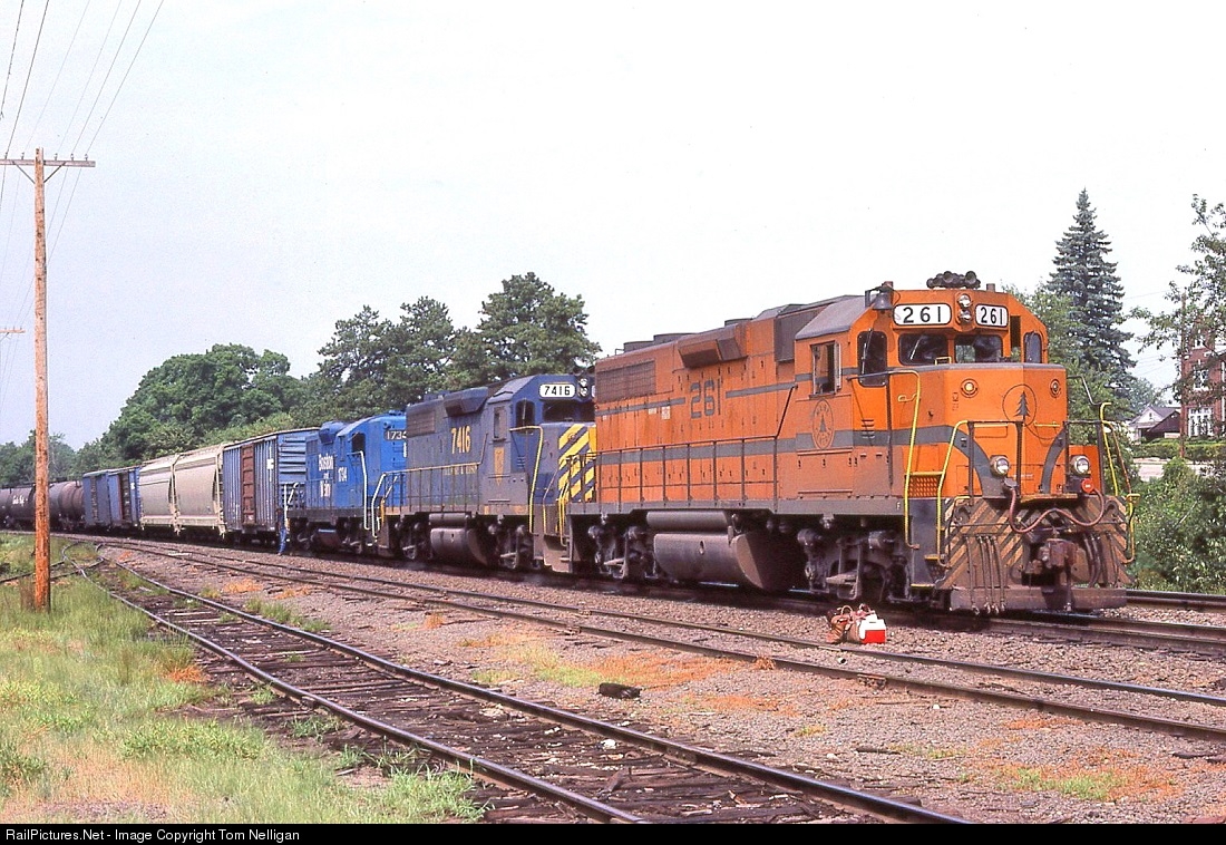 Three railroads and three models are represented in the lashup pulling Boston & Maine train MELA (Mechanicville, NY, to Lawrence, MA) as it pauses for a crew change at Ayer, MA. A Maine Central GP38, a Delaware & Hudson GP39-2, and a B&M GP9 make up the mix.