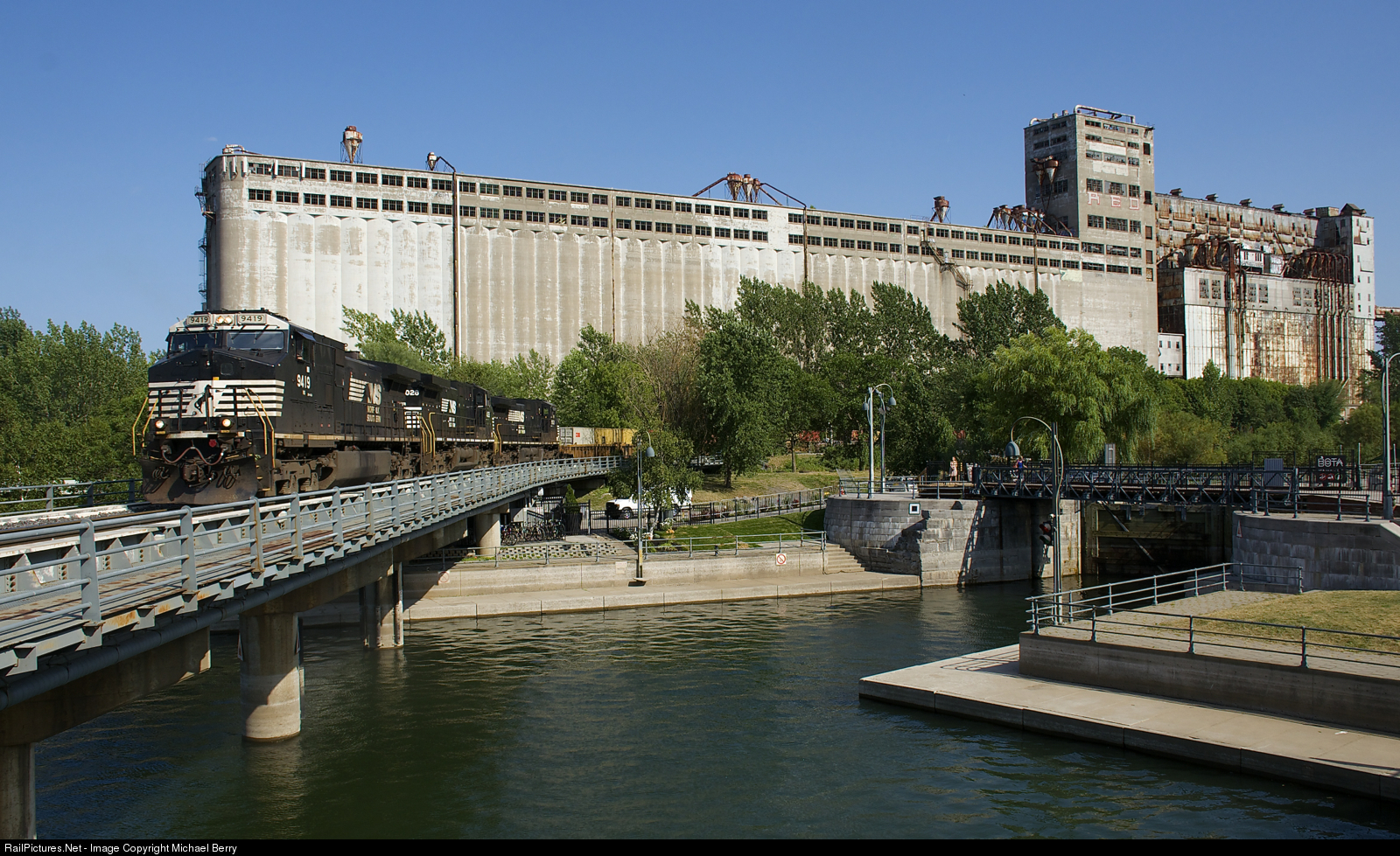 | Operating as CN 596, NS power (NS 9419, NS 4028 & NS 9521) is bringing CN X148 into the Port of Montreal after the train spent most of the day parked on CN's Montreal Sub. Behind the train is the massive but out of use grain elevator #5. |