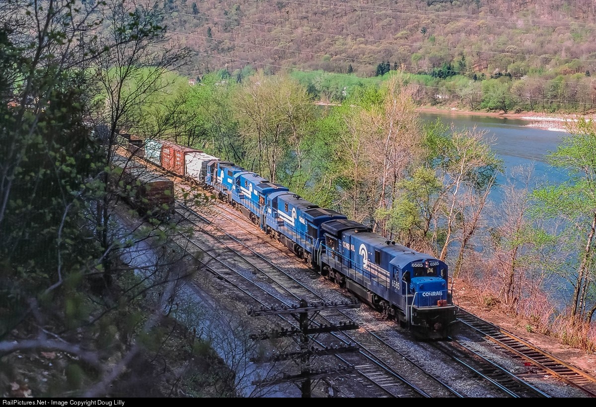 | Paralleling the Susquehanna River, Conrail train ALCG gets its air at the west end of the yard in Coxton, Pennsylvania. |