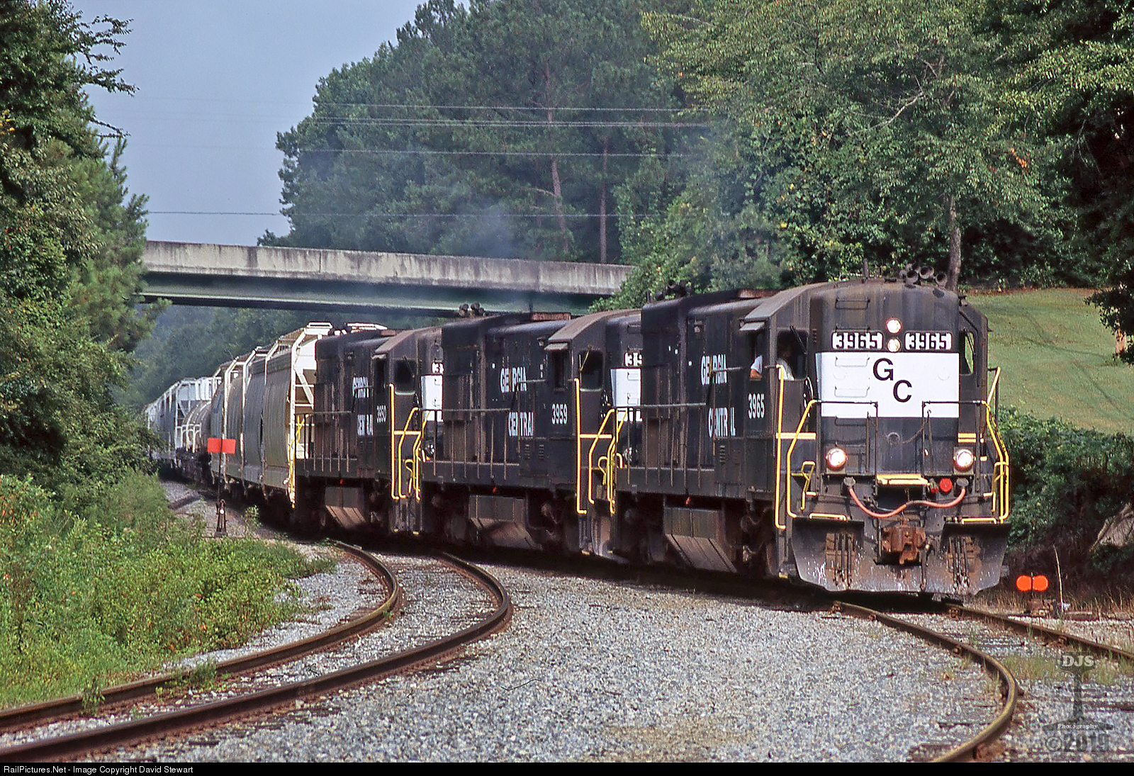 | Georgia Central U23B 3965 and two other high hood U23Bs lead Y101 onto the Dry Branch and off the mainline in September of 2003. The Dry Branch lost it's operation in 2009 and no longer sees service. GC 3965 survives today at SARM in oak Ridge, Tennessee. (Slide Scan) |