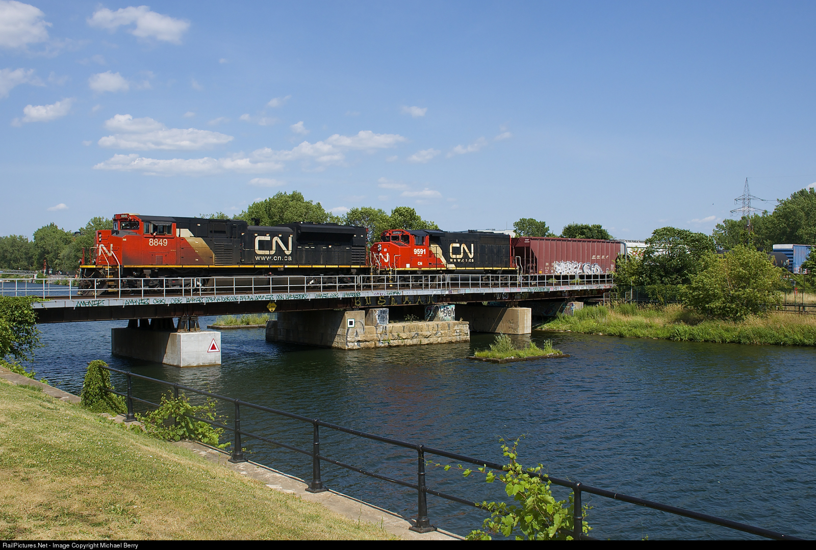 | CN 527 with CN 8849 & CN 9591 for power advances over the Lachine Canal after dropping off part of his train on the Butler Spur. Soon he will be back up over the canal with cars to both set off and lift in Pointe St-Charles Yard before he heads to Taschereau Yard. |