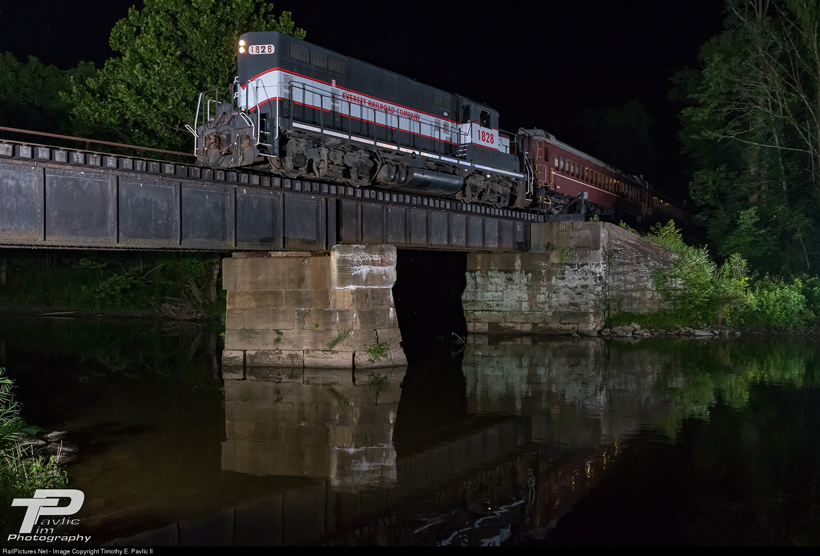 The first Evening Ice Cream Special (to my knowledge) crosses the Little Juniata River in the Reservoir area of Hollidaysburg. The Everett Railroad rarely runs after the sun goes down, aside from the occasional photo charter, which makes night flash photos of this area short line hard to come by.