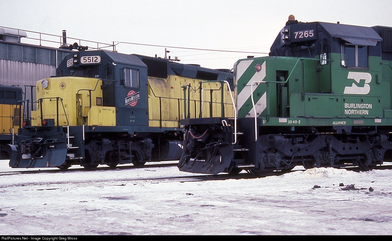 CNW 5512 shares space with BN 7265 at the engine facility in Butler (Milwaukee), WI in January of 1984. Unfortunately, this UP facility has recently closed.
