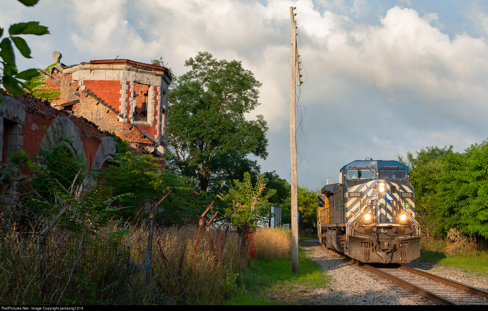 | On a mostly cloudy Sunday morning, the sun peaks out from the clouds just in time for the loaded grain train on the Falls Road to pass the old station in Lockport NY. |