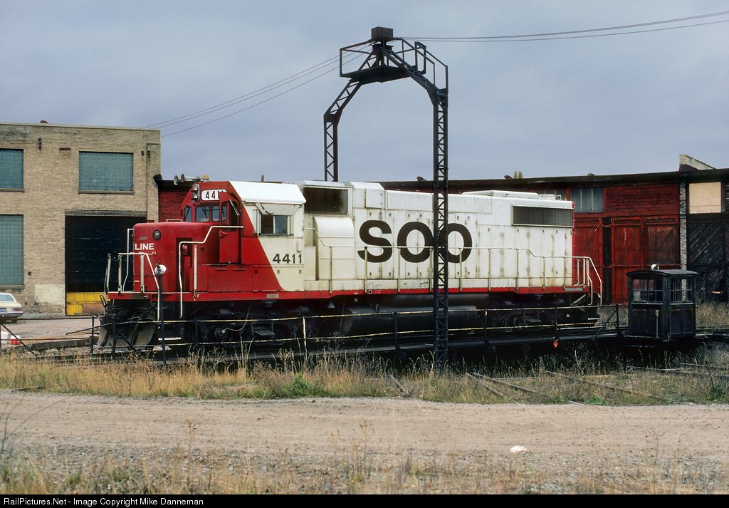 After arriving from the east on the former DSS&A line from Munising, Soo Line GP38-2 No. 4411 takes a spin on the turntable before going to bed in the roundhouse at Marquette, Michigan, on October 25, 1986.