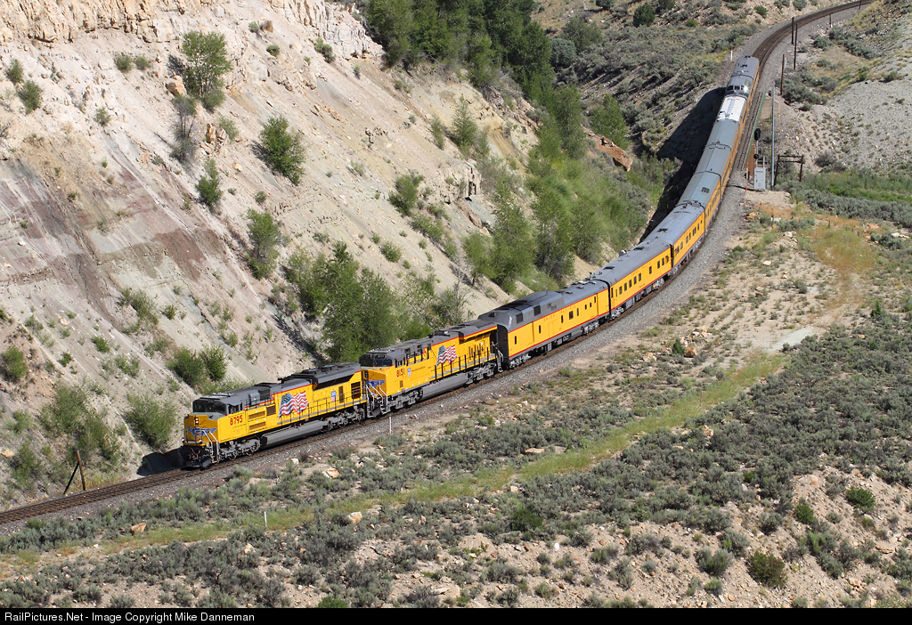See beautiful diesel locomotives in UP's traditional armour yellow livery and special commemorative paint schemes pulling long trains of yellows cars reminiscent of the days when UP domeliners seemed to go Everywhere West.