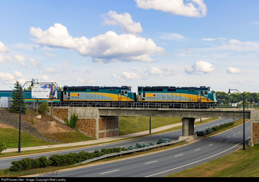| After it's crew change at Moncton, New Brunswick, VIA 15 continues on, passing over a somewhat quiet Vaughan Harvey Blvd. |