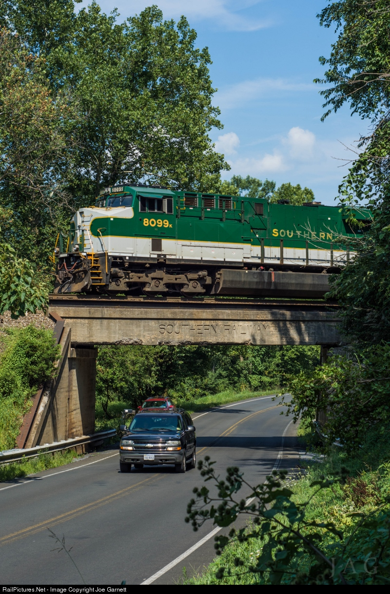 It's a warm August evening, and Norfolk Southern intermodal train 227 is running well behind schedule as it heads west on the 'B-Line'. Seen here having crested the grade, the somewhat short train crosses the busy Route 55 bridge, adorned with the lettering 'Southern Railway'. As an added bonus, NS's 'Southern' painted ES44AC was leading the train, with a rather large crowd gathered for this most opportune shot.