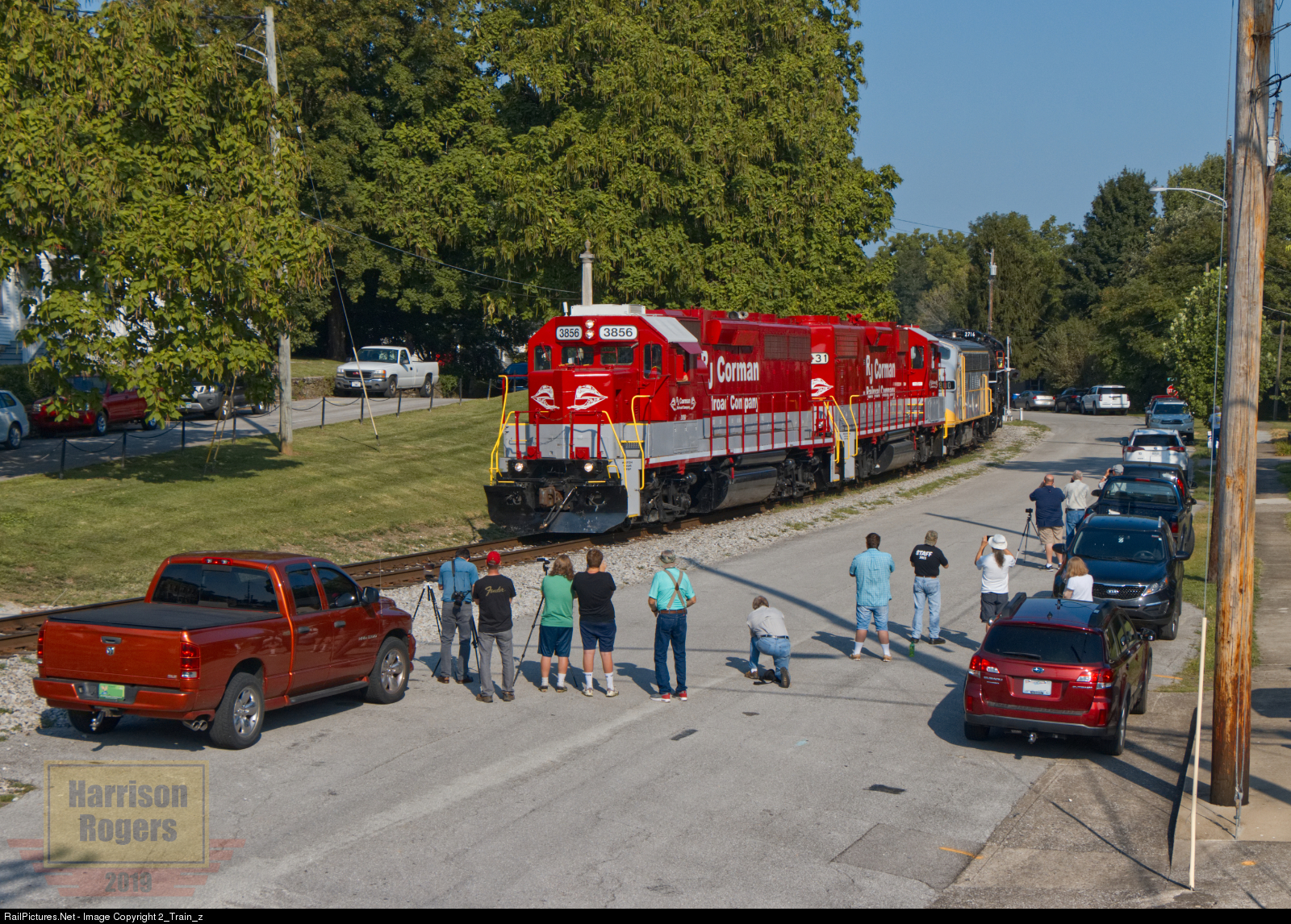 | RJ Corman 3856 leads the Heritage Highball train into Midway for a display, as a crowd of train fans watch and get their photos. |