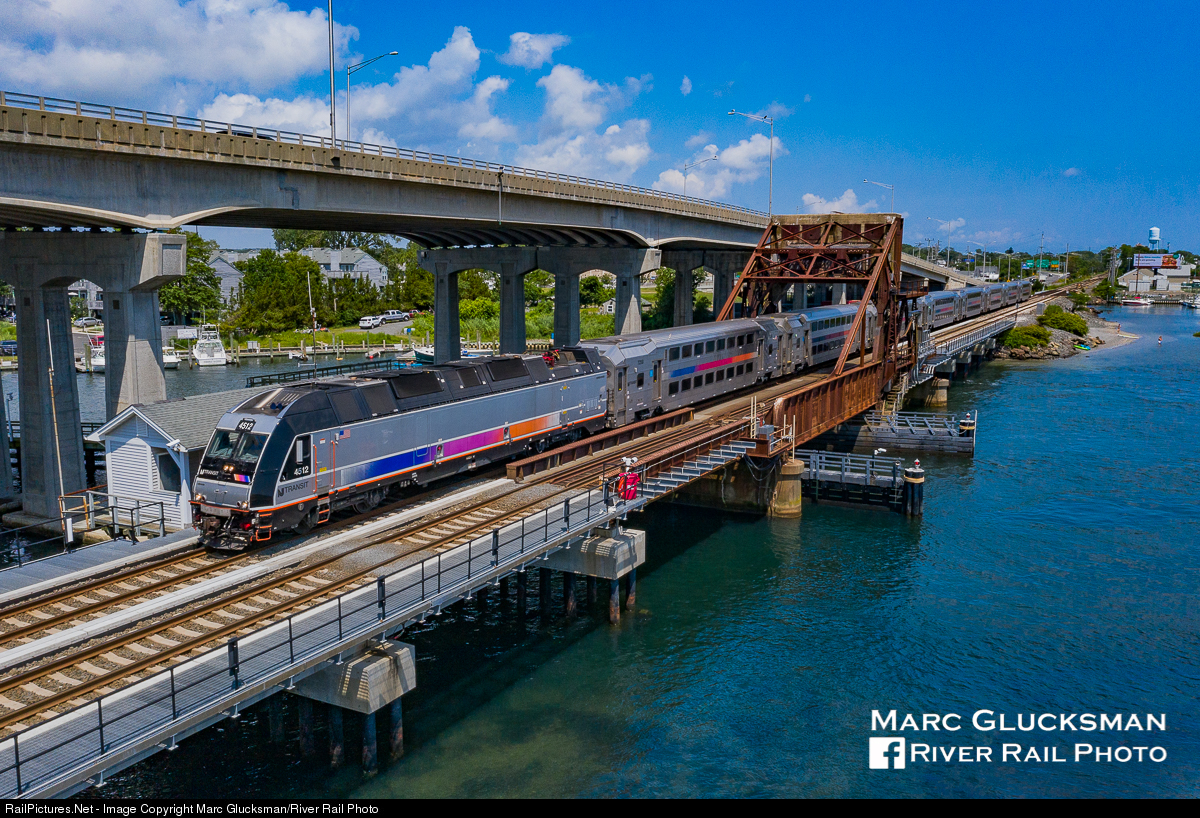 Where can it be Shark Week all the time? NJ Transit Train 4733 lead by 4512 (ALP45-DP) with eight multi-level cars is filling the part of a very oversized Long Branch to Bayhead shuttle as it passes over the Shark River in Belmar, NJ on the afternoon of Saturday, August 3, 2019. For this summer, NJ Transit has returned to almost hourly service for this run throughout the day during the peak season.
