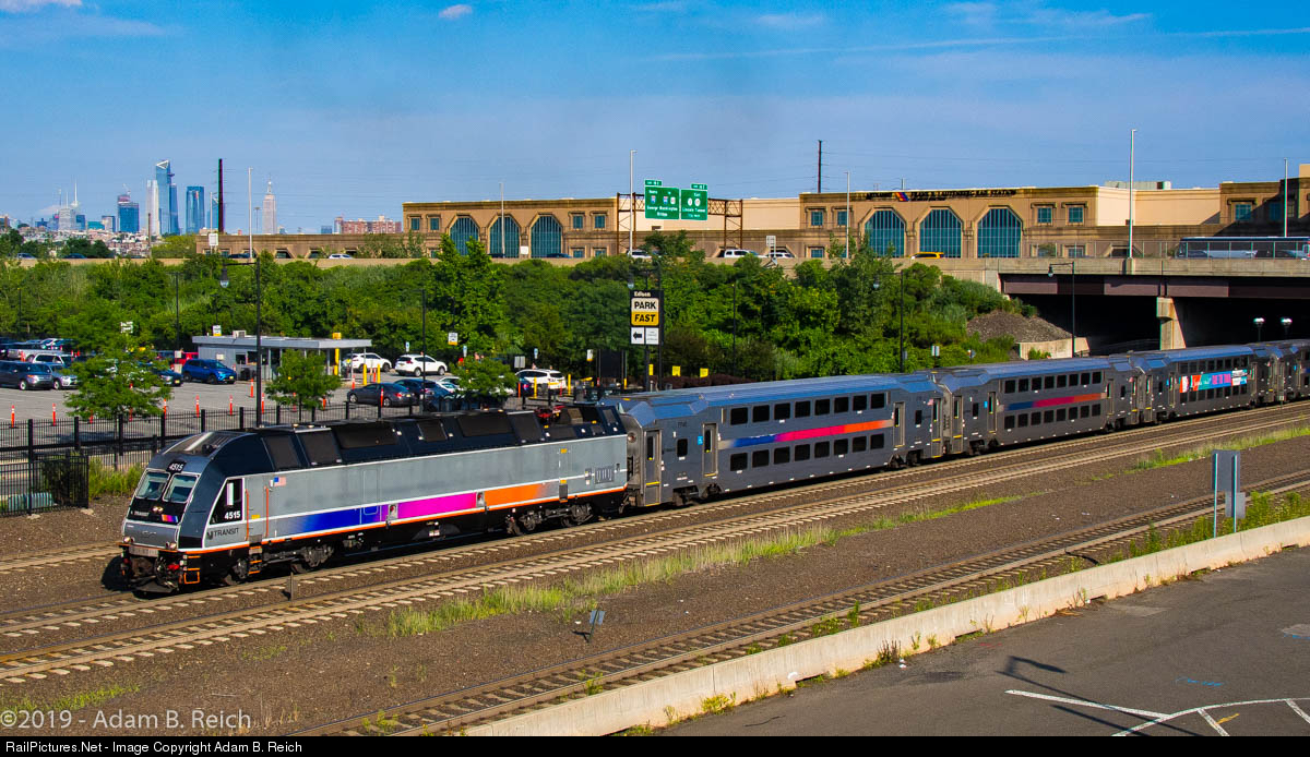 In the Shadow of Gotham: NJ Transit Bergen County Line Train 1877, en route to Waldwick, departs Secaucus Junction on Saturday, August 3, 2019. Visible in the background is the Eastern Spur of the New Jersey Turnpike and portions of Midtown Manhattan, including the Empire State Building.