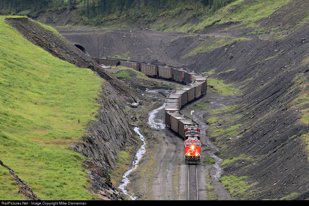 A Canadian National empty coal train works upgrade on the Luscar Industrial Spur near Cadomin, Alberta, on August 8, 2016. The curious jog in the track 5 cars back is where a switch was once located for a track operating to the Gregg River loadout, which was torn out quite a few years ago. Soon, the train will be loading at the Luscar Mine loadout that is part of Teck’s Cardinal River Operation, and is located at the highest elevation on the Canadian National system.