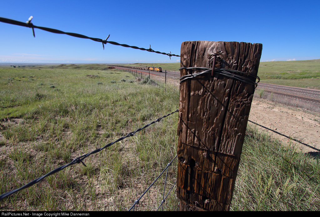 A stout, wooden tie that once supported heavy trains rolling over steel rails is now holding up just a few barbed wires and fencing—and planted into the soil vertically like the tree it once was—standing on an earthen rise overlooking tonnage trundling over Wyoming’s Logan Hill. Another train approaches in the form of a Union Pacific coal empty heading north for more loads of coal on June 22, 2019.