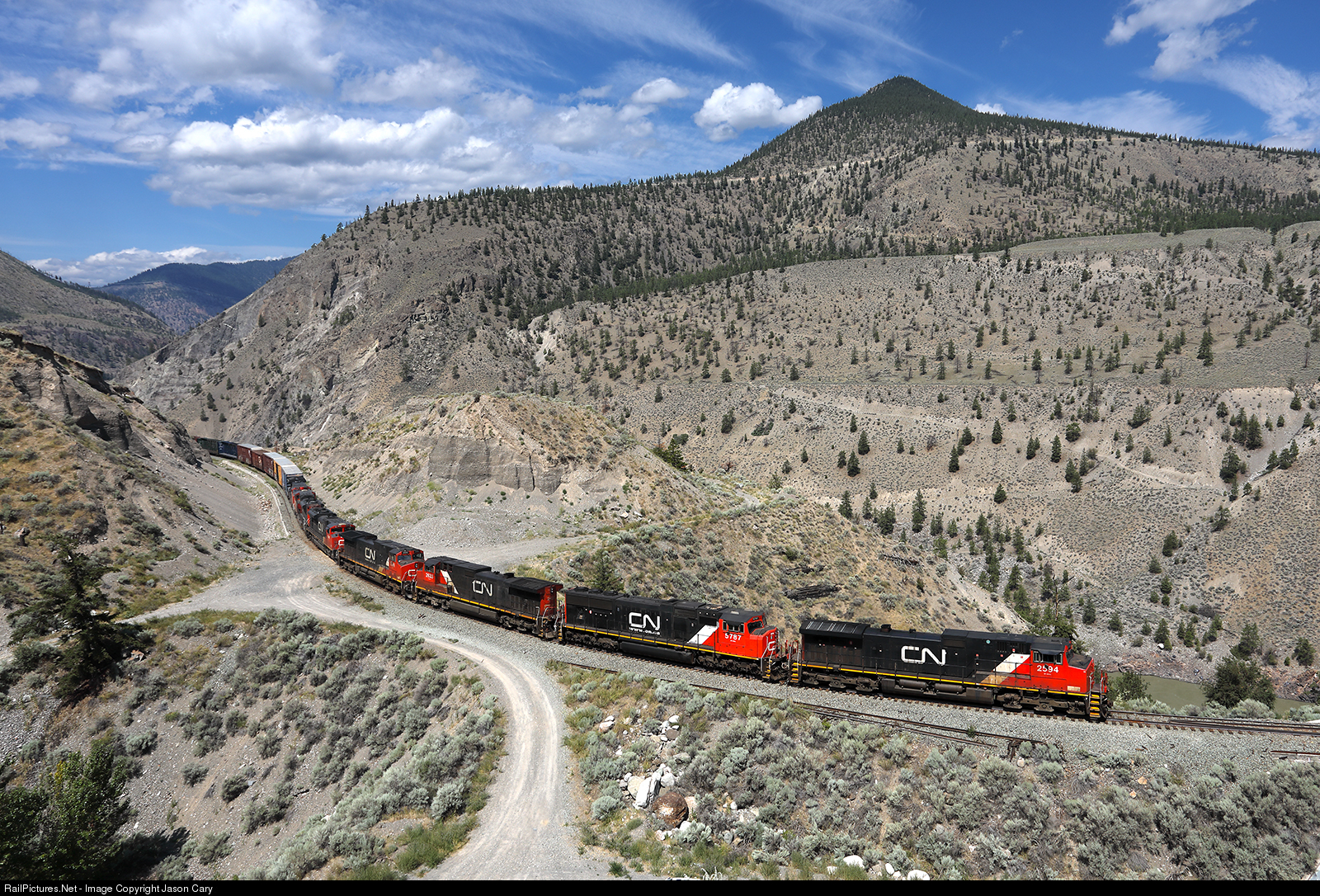 Train 571 is Northbound curling thru the ten degree curves that mark the start of the 2%+ grade of Kelly Lake Hill. This section of the ex. BC Rail is also referred to as the Pavillion Mountain Grade. The train has seven motors that are being repositioned to Williams Lake. Those motors will serve as DPU and power that will bring overflow tonnage south as an extra.
